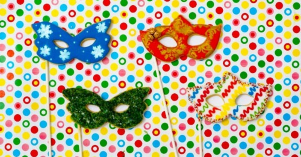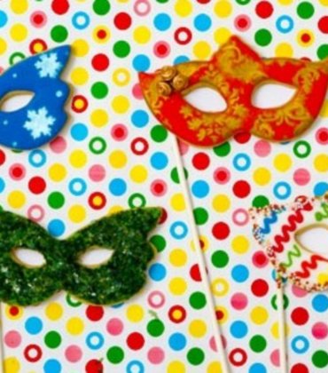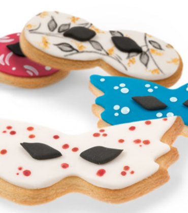 Testo razvaljamo na 0,5cm debelo in z modelčkom za masko izrežemo maske in jih položimo na pekač, katerega smo obložili s peki papirjem in damo v prej segreto pečico na 175°C ter pečemo 10 - 12 min. Pečene pustimo, da se ohladijo, medtem pa razvaljamo sladkorno maso in jo z modelčkom za maske izrežemo. Sladkorno maso lahko prilepimo na piškotek tako, da uporabimo jedilno lepilo ali pa s čopičem , katerega smo zmočili v vodi na rahlo premažemo površino piškota (pazite, da ne boste preveč).
