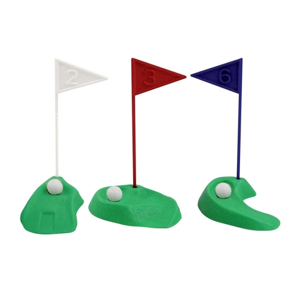 Paket vključuje: 3 zastave, 3 palice, 3 zelenice za golf s pritrjeno žogo in igralca golfa.
