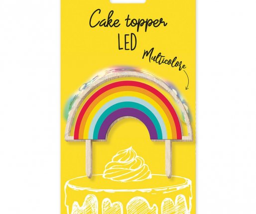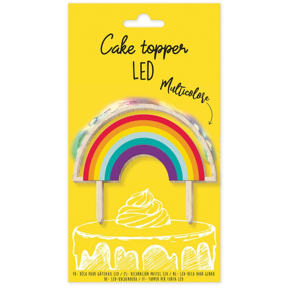 Toper za torto sestavlja topel lesen dizajn mavrice obdan z nežnimi pisanimi led lučkami.