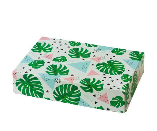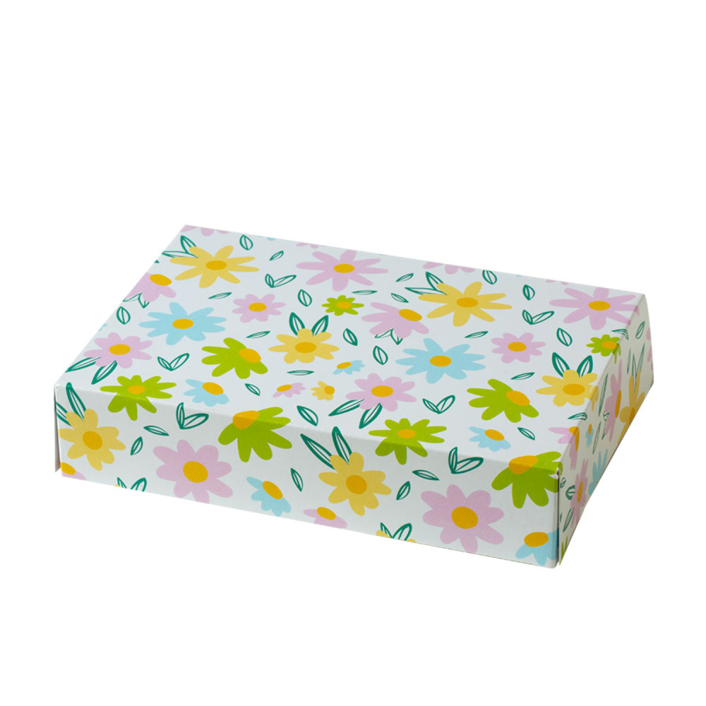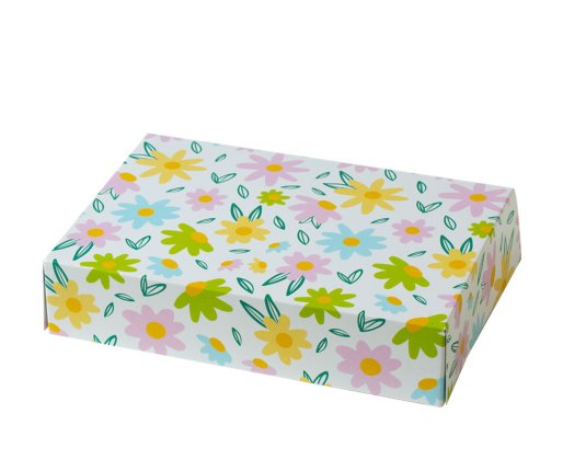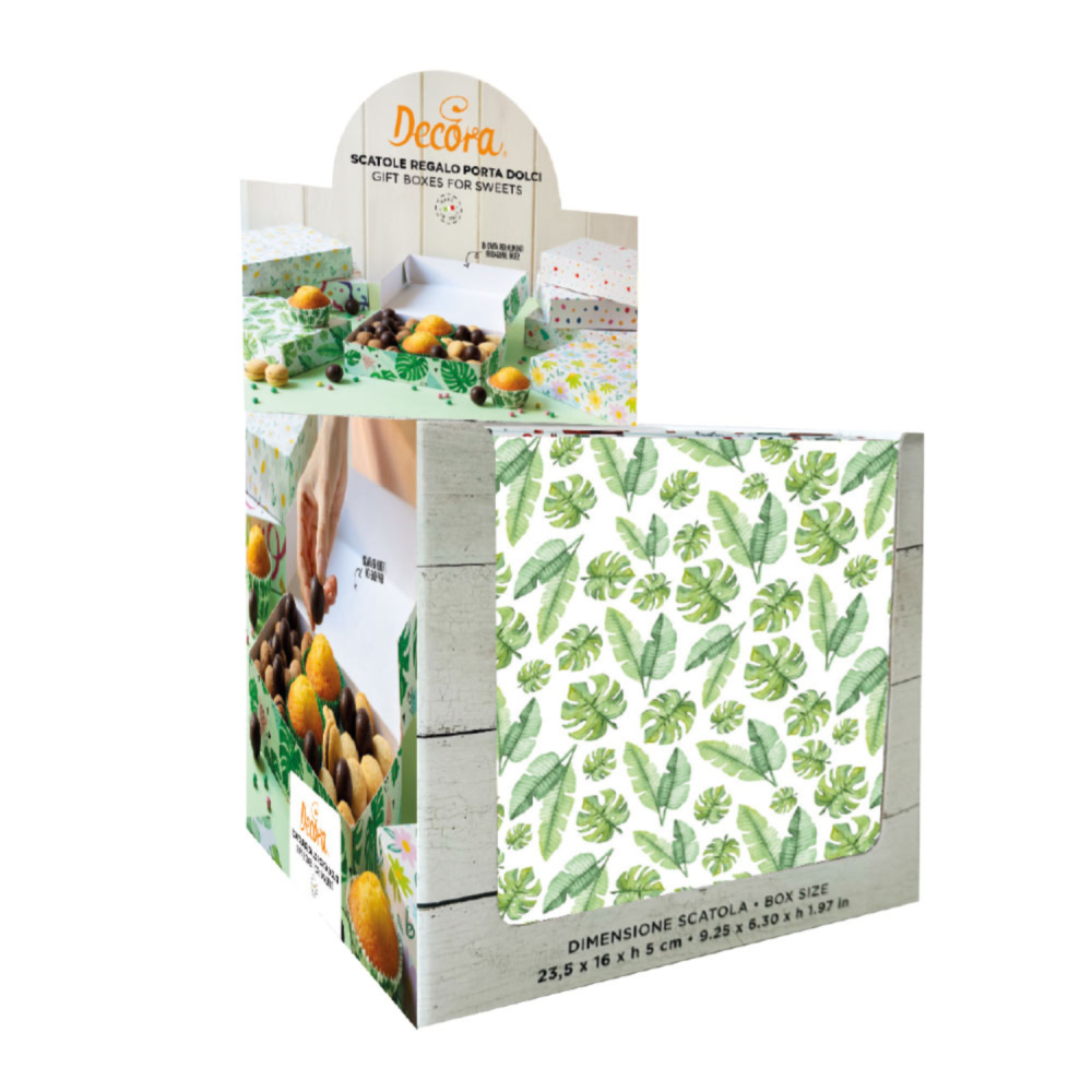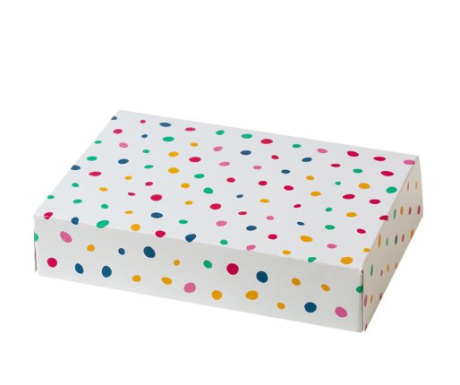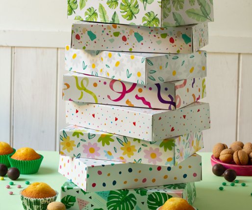 Škatle so izdelne iz odpornega kartona, primernega za stik z živili. Idealne so za pakiranje peciva, krofov, kolačkov, piškotov in drobnih sladkarij ter lahko jo uporabite tudi za pripravo - zavijanje darila.