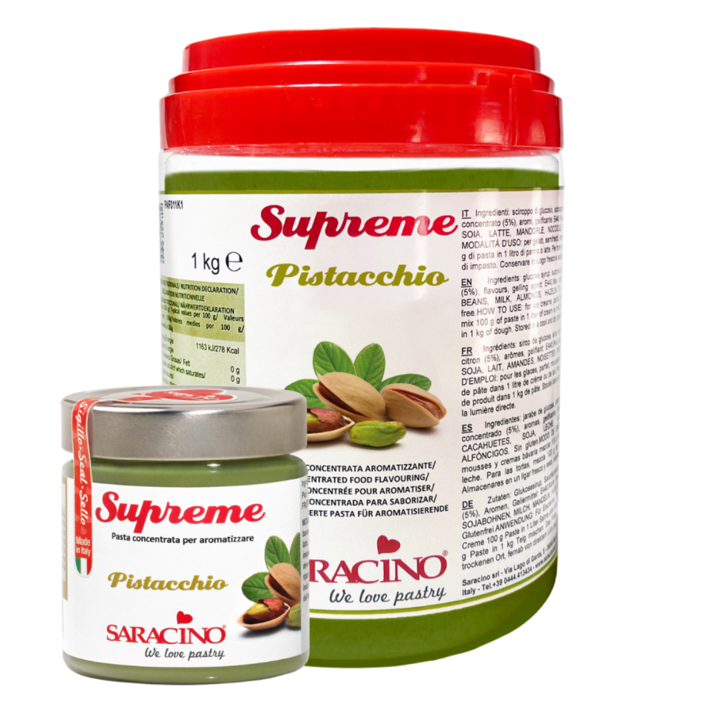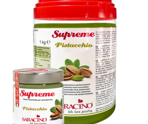 Saracino pistacijeva pasta je izdelana iz 100% skrbno izbranih pistacij, oluščenih in praženih. Pistacije so mešane, dokler mešanica ni kremasta, gladka in nepogrešljivega vonja. To pasto lahko uporabljate za več namenov. Priporočamo uporabo 100 gramov na do 1 kg mase za sladoled, ali jajčno kremo, smetano, biskvit in je zelo dobra kot polnilo za čokoladne bonbone. Pasta bo poleg zelo lepe arome in edinstvenega okusa, obarvala vaše sladice, zaradi česar bodo še bolj vabljive - privlačne. Pistacijeva pasta Saracino ne vsebuje emulgatorjev ali sredstev za zgoščevanje, je naraven proizvod 100% in predstavlja edinstvene organoleptične lastnosti.