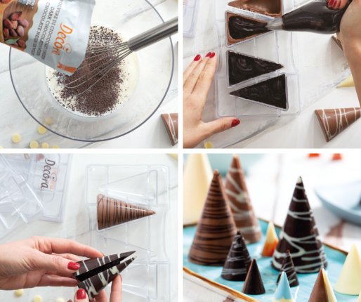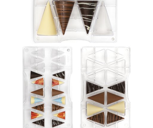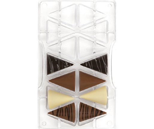 Profesionalni kalupi iz polikarbonata, materiala, ki vam omogoča pridobivanje sijočih in popolnih čokolad. Pomembno je, da čokolado dobro temperiramo, preden jo vlijemo v model.