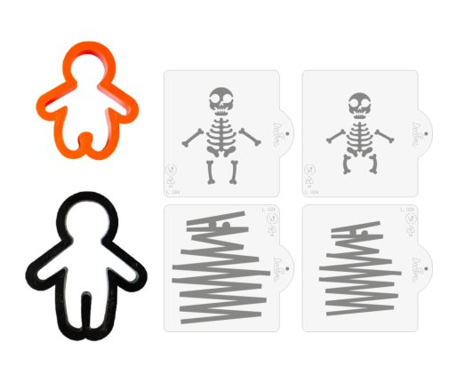 Komplet vsebuje 2 plastična modelčka za piškote in 4 šablone iz plastike. To je popol komplet za ustvarjanje tridimenzionalnih modelov katere lahko okrasite s kraljevsko glazuro, s čokolado, s sladkornim posipom, s kakavom, z barvnimi prahovi ali spreji oz. z air brushom.