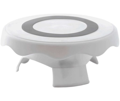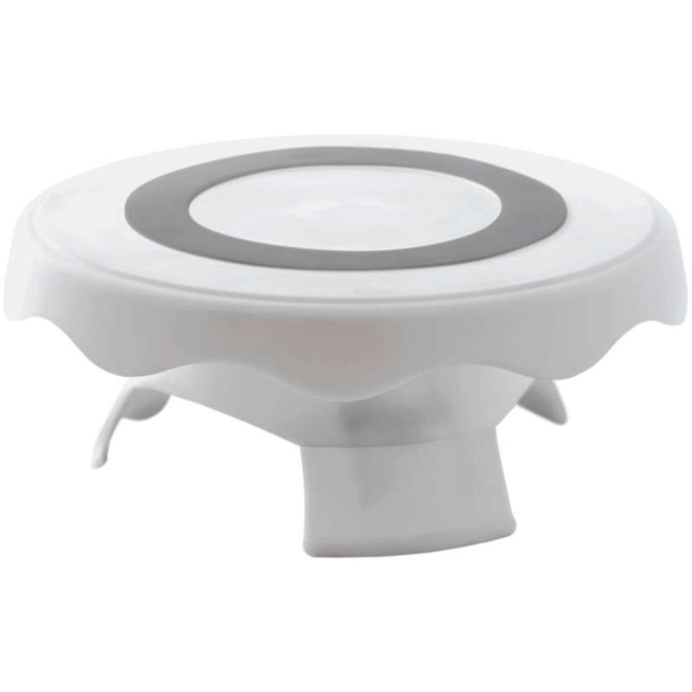 Izdelano iz trpežne, močne plastične mase, to stojalo je izdelano za podporo različnih velikosti tort in je popoln pripomoček za okrasitev za začetnike ali dijake in študente kulinaričnih šol ter tudi za profesionalne slaščičarje. Njegova funkcija zagotavlja željeno višino, medtem ko vi krasite vašo torto ali sladico. Nedrseča podlaga in obroč z mehkim oprijemom poskrbita, da se torta med dekoriranjem ne premakne. Poleg tega nazobčani robovi ne dodajo samo elegantnega pridiha, temveč omogočajo tudi enostavno vrtenje zgornje plošče. Noge se varno zaklenejo na mestu za okrasitev in se zložijo za enostavno shranjevanje.