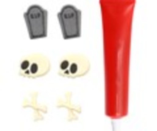 Komplet vsebuje 20 g tubo užitne sluzi + 6 okraskov z različnimi motivi (lobanja, kosti, spomenik), vsak meri približno 35 x 20 mm. Vsak komplet sladkornih okraskov je ročno izdelan in izdelan iz užitne gumpaste.