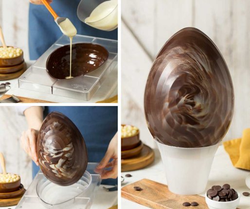 Profesionalni kalup iz polikarbonata, materiala, ki vam omogoča, da dobite sijoče in popolne čokolade. Pomembno je, da čokolado dobro temperirate, preden jo vlijete v model.