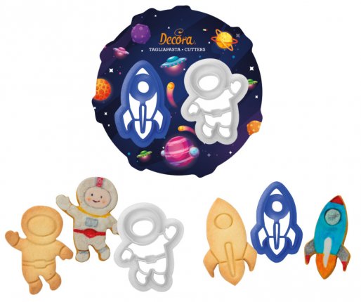 Plastični komplet modelčkov za piškotke, ki ga sestavljata astronaut in raketa.