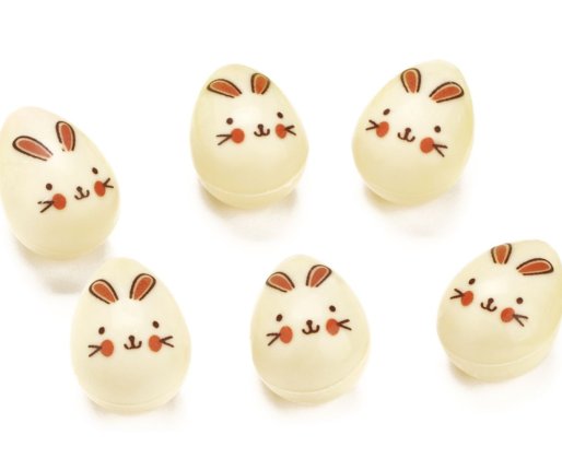 Vsako jajce meri približno 35 × 26 mm in je izdelano iz bele čokolade.