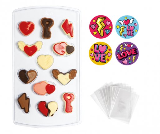 Komplet vsebuje: model, 40 prozornih vrečk 8 x 8 cm in 40 nalepk za pakiranje čokolade 3cm.